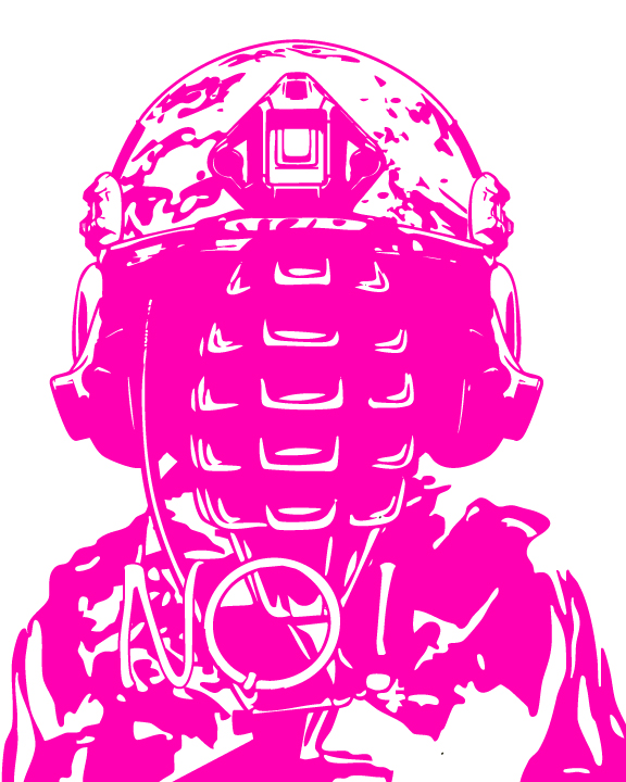 In my version, those relics are replaced with their modern counterparts—a contemporary helmet and grenade—because the struggle has not changed, only its machinery. The same pink remains, carrying forward that electric urgency, that refusal to submit.